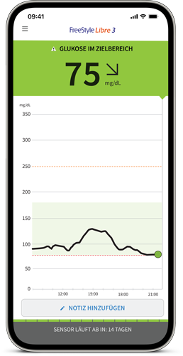 Neben dem aktuellen Glukosewert zeigen Ihnen die Trendpfeile, in welche Richtung und wie schnell sich die Glukose in den nächsten 15 Minuten bewegen wird. Damit wird Ihr Glukoseverlauf besser vorhersehbar und Sie können erkennen, welche Faktoren (z. B. Nahrungsmittel, Bewegung, Stress) Ihre Glukosewerte wie beeinflussen. Zudem helfen sie dabei, Glukoseveränderungen besser einzuschätzen und entsprechende Maßnahmen zu treffen.
